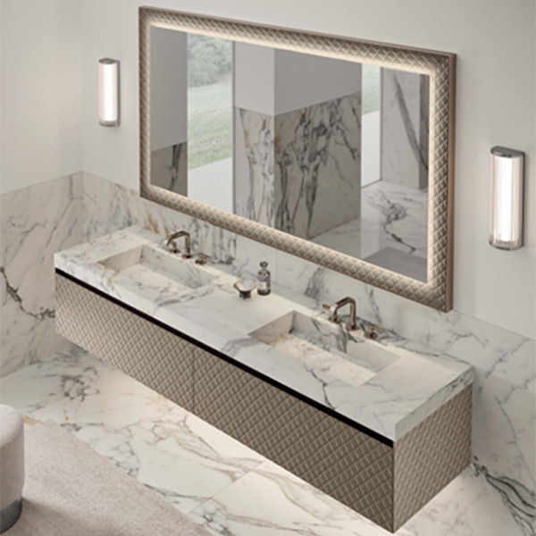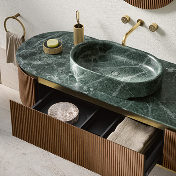 Фасады мебели и столешницы (термодуб, тик, венге): Бренды такие как Milldue, Mia Italia, Lineatre специализируются на мебели из массива, обработанного для влажных помещений. Почему стоит: Дерево добавляет неповторимое тепло, контрастируя с холодом камня и керамики. Тактильно приятно. Имеет не повторимый рисунок.